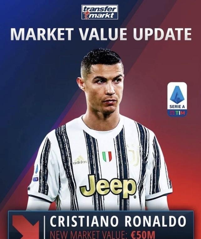 JRS直播网3月24日讯,权威外媒德国《转会市场》更新了葡萄牙巨星C罗的最新身价。相比于去年年底,C罗的身价3个月内又下降了1000万欧元,跌至5000万欧元,不到目前身价排名第一位的姆巴佩的1/3,法国天才的最新身价为1.8亿欧元。