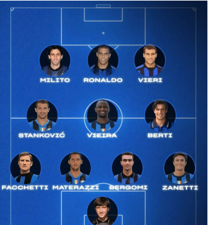 如图,这是一个433阵容,门将位置上是国米传奇门将曾加。而后防线上四人分别是萨内蒂、贝尔戈米、马特拉齐和法切蒂。中场方面分别是斯坦科维奇、维埃拉和贝尔蒂,而前场三叉戟是最引人关注的,他们分别是罗纳尔多、维埃里和米利托。这三名球员巅峰时期,几乎都是无解的存在了。不得不说,这个阵容真的非常强大,估计大部分国米球迷都会认可。