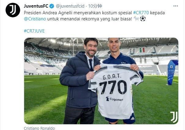 第28轮,尤文对阵贝内文托。比赛开始前,阿涅利为C罗颁发770球纪念版球衣。球衣印字和印号分别为:“G.O.A.T”、“770”。