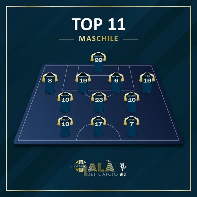 在这套最佳阵容中,多纳鲁马镇守球门,后防线上的4个人是特奥、德弗里、博努奇和戈森斯,3名中场是路易斯-阿尔贝托、巴雷拉和戈麦斯,3名前锋是C罗、因莫比莱和迪巴拉。