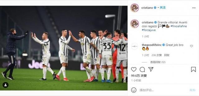 比赛结束后,C罗在社交媒体中发布了一张与队友击掌庆祝胜利的照片,并配文到:“伟大的胜利!就这样继续下去,斑马军团加油!”