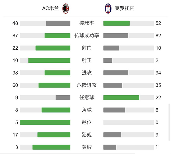 查看:AC米兰vs克罗托内 全场录像技术统计:
