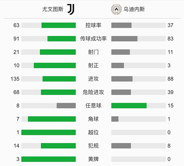 查看:尤文图斯vs乌迪内斯 全场录像技术统计: