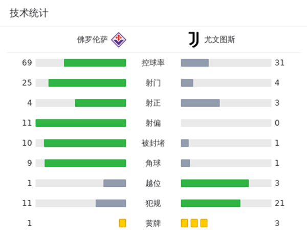 全场比赛结束,佛罗伦萨0-1尤文图斯。