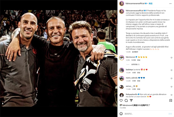 JRS直播网讯 北京时间6月8日晚,50岁的意大利传奇法比奥-卡纳瓦罗在个人社媒确认,乌迪内斯高层已经告知,不会在下赛季与他继续合作。卡纳瓦罗失望写道:“我本来想留在乌迪内斯继续执教,但俱乐部却告知我(不留用)这一决定。我只能祝乌迪内斯未来好运。”