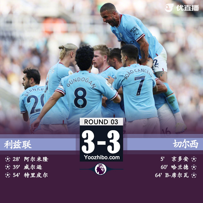 JRS直播网讯北京时间8月21日23点30分,英超第3轮曼城客场挑战纽卡斯尔。上半场,京多安闪击破门,曼城攻势占优,波普多次贡献扑救,阿克伤退,圣马连续助攻阿尔米隆和威尔逊完成反超。下半场,哈兰德中柱,特里皮尔任意球破门,哈兰德和B席先后进球将比分扳平,全场比赛结束,曼城3-3纽卡斯尔。