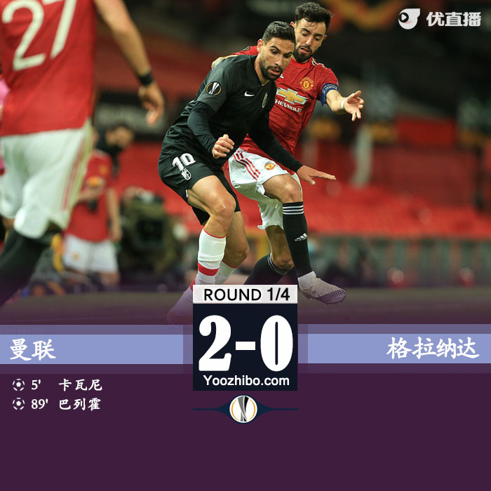 JRS直播网4月16日讯 北京时间4月16日凌晨3:00,20-21赛季欧联杯1/4决赛第二回合继续进行,曼联在老特拉福德主场迎战格拉纳达。上半场,博格巴助攻卡瓦尼抽射破门,曼联1:0暂时领先格拉纳达。下半场补时阶段,巴列霍自摆乌龙。最终曼联主场2:0格拉纳达,曼联两回合总比分4:0轻松晋级四强。