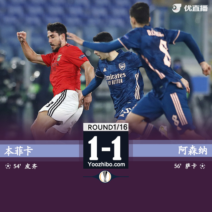 JRS直播网2月19日讯 北京时间2月19日4:00,欧联杯1/16决赛首回合一场比赛在本菲卡和阿森纳之间进行。上半场奥巴梅扬失良机,扎卡传球失误险些造成丢球。下半场史密斯-罗送点皮齐主罚命中,萨卡扳平比分,奥巴梅扬再次错失机会。最终阿森纳客场1-1战平本菲卡,双方次回合较量将在2月26日进行。