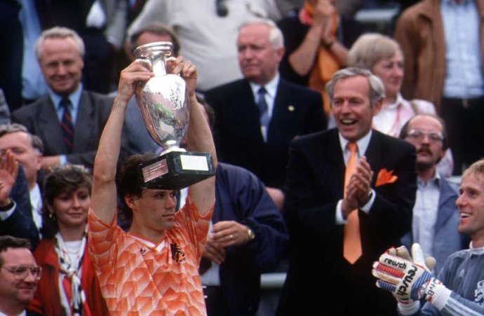 古力特带领队友鱼贯登上领奖台,轮流高举欧洲杯奖杯。之后有在接受苏联球员祝贺后坐在一起跺脚庆祝!荷兰足球终于站在了欧洲之巅!!