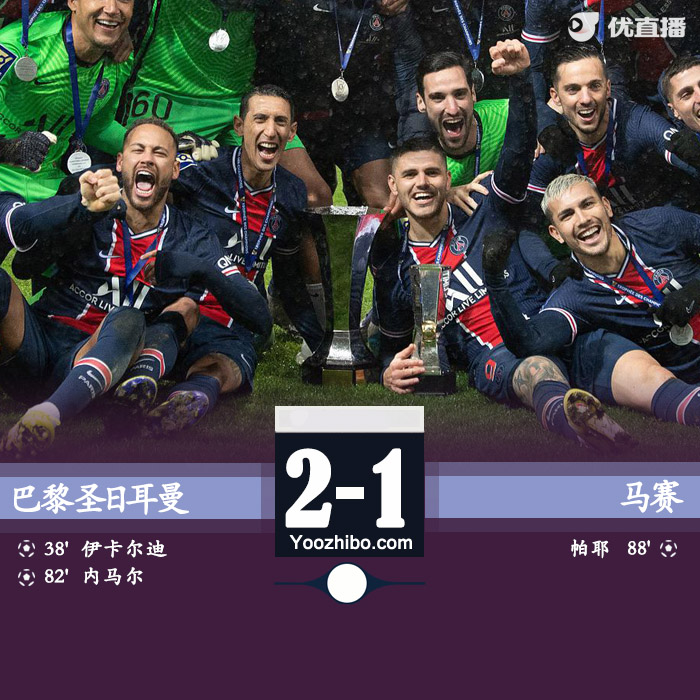 JRS直播网1月14日讯 北京时间1月14日4:00,法国超级杯决赛打响,巴黎圣日尔曼迎战马赛。上半场,伊卡尔迪、姆巴佩接连越位进球被吹,伊卡尔迪打破僵局后又击中横梁。下半场,内马尔复出登场点球建功,帕耶扳回一球。全场比赛结束,巴黎2-1战胜马赛,连续八年夺得法国超级杯。