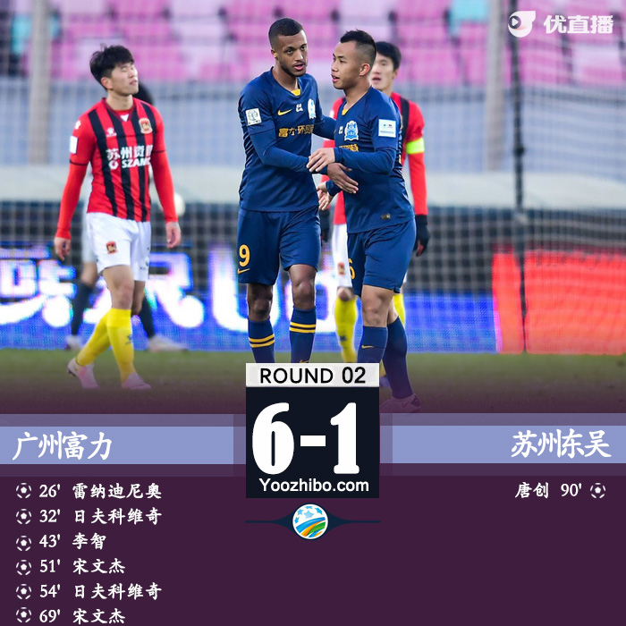 下半场比赛,第47分钟,富力获得禁区前沿右侧定位球,雷纳迪尼奥主罚选择直接攻门,皮球绕过人墙稍稍偏出右侧立柱。第50分钟,日夫科维奇左路接球界外球后,内切摆脱两人防守后,禁区左侧右脚的攻门被袁伟豪扑出,宋文杰补射将球打进,广州富力4-0苏州东吴。第54分钟,富力后场长传球给到左路,日夫科维奇左路接球后内切摆脱防守后,禁区左侧贴地斩打远角得手,广州富力5-0苏州东吴。第56分钟,苏州东吴获得前场右侧定位球,李智任意球直接攻门,韩佳奇双拳将球击出。第58分钟,雷纳迪尼奥中场右侧挑传打到弧顶附近,日夫科维奇停球到禁区内,左脚的凌空抽射被袁伟豪扑出。