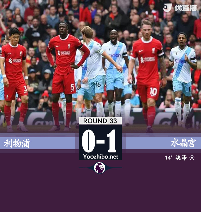 JRS直播网讯:北京时间4月14日,英超联赛第33轮,利物浦在主场迎战水晶宫。比赛第14分钟,埃泽率先得分,第18分钟,范戴克滑到送马特塔单刀,罗伯逊贡献门线解围,第27分钟,远藤航乱战中击中横梁。最终利物浦主场0-1水晶宫连续3场比赛不胜,落后目前榜首曼城2分。