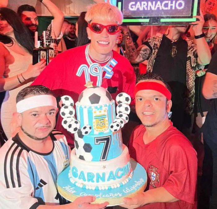 加纳乔的生日蛋糕非常特别,除了顶上有代表自己岁数的数字「19」之外,蛋糕上还有7号和他的名字。有趣的是,蛋糕由两个小矮人抬着,一个身穿阿根廷球衣,另一个则是葡萄牙队战袍。
