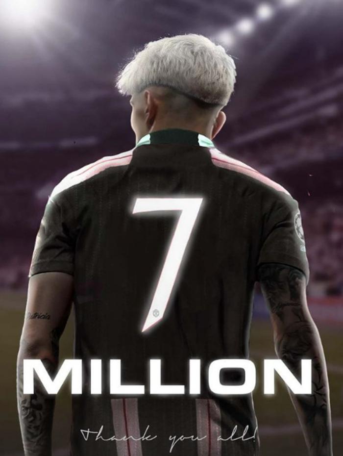 在加纳乔发布的另一张图片中,他则直接身穿7号球衣。这是为了庆祝他的社交账号关注人数突破700万。但如果曼联给予19岁的「新C罗」7号球衣,他将坦然接受,因为这是阿根廷小将最爱的号码,他的账号就是「garnacho7」。