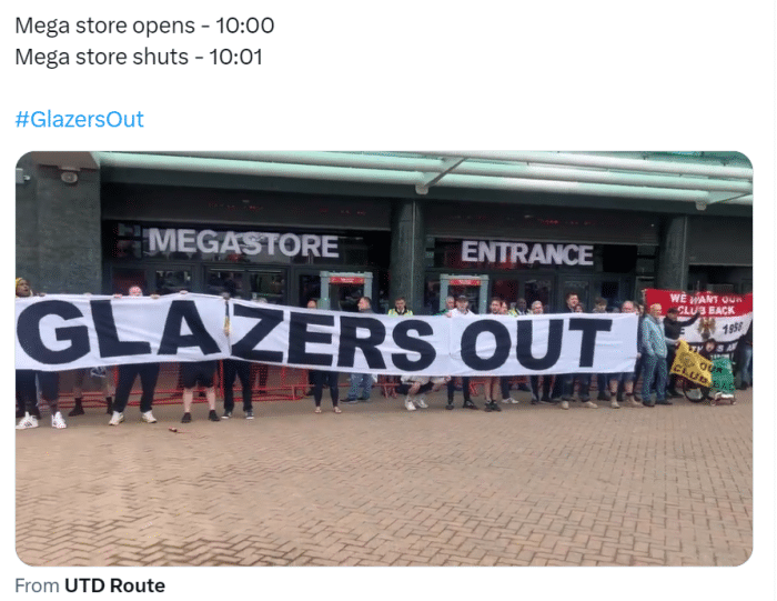一两百名球迷拿着各色标语,旗帜鲜明地反对格雷泽家族,从早上9点半就已经开始聚集。曼联商店上午10点开门营业,但10:01就不得不关门大吉,因为球迷群情汹涌。抗议者的标语上写着:「格雷泽滚蛋!」「完全出售俱乐部!」「别再喂养贪婪的格雷泽!」