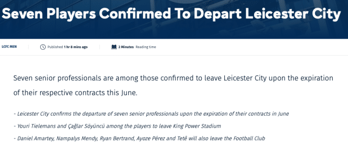 JRS直播网06月06日凌晨,本赛季降级的莱斯特城队官方宣布,蒂莱曼斯、瑟云聚、阿马泰、纳帕里斯-门迪、伯特兰德、阿约泽-佩雷斯、泰特7名球员赛季结束后离队。