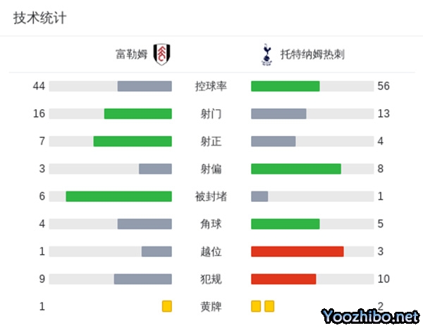 关键事件: 第42分钟,罗宾逊左路传中,穆尼斯中路插上带到小禁区低射得手!热刺0-1富勒姆↓