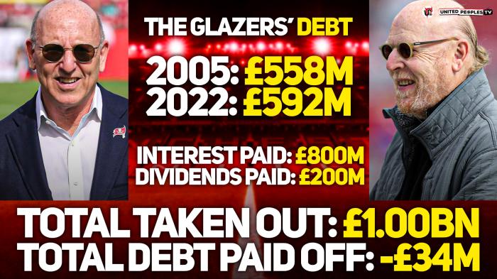 JRS直播网05月23日曼联老板格雷泽家族收购俱乐部18年以来,从未向球队投入自己的一分钱,相反,他们将「杠杆收购」的5亿英镑债务转移到红魔账上。之后,格雷泽以利息、分红等模式,从曼联拿走了超过10亿英镑。举个例子,格雷泽六兄弟姐妹每年坐享2200万英镑左右负的分红,无论俱乐部盈亏都雷打不动。因此,红魔拥趸将这个家族称为「吸血鬼」。