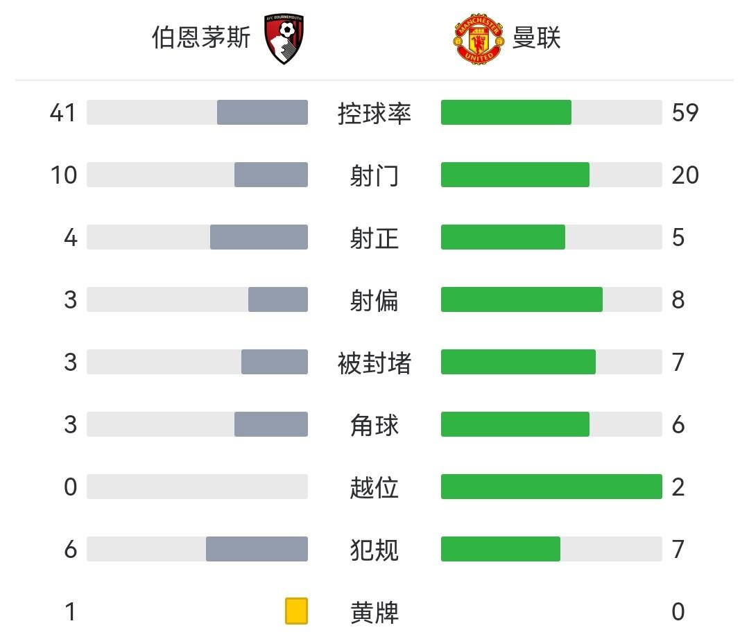 最终全场比赛结束,曼联1-0战胜伯恩茅斯。