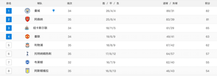 JRS直播网05月08日,英超联赛第35轮结束了两场焦点战角逐。最终曼联客场0-1输给西汉姆联,而纽卡斯尔则主场0-2被阿森纳终结了3连胜的步伐。在纽卡和曼联先后输球后,本赛季英超争四悬念重新燃起。