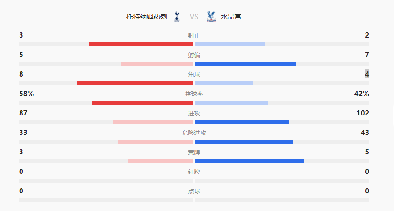 热刺终结了四轮不胜,目前积57分排名第6;而水晶宫积40分排名第12位。