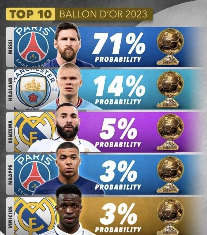 挪威天才哈兰德以14%的可能性,紧随梅西之后排名第2位。哈兰德最大的优势就是他本赛季在曼城打破的多项纪录。这位曼城天才本赛季极有可能包揽英超、欧冠和本赛季的欧洲金靴。而如果哈兰德最终跟随曼城夺得英超和欧冠冠军,那么他对梅西的威胁将会空前之大。