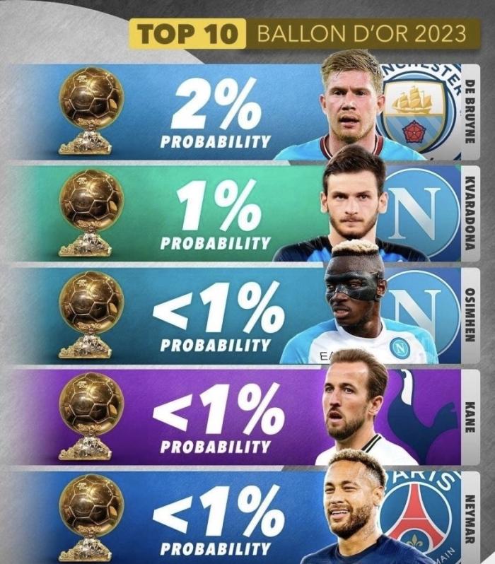 此外,姆巴佩与威尼休斯都以3%的可能性,并列第4位,两人得奖概率不大。曼城大脑德布劳内以2%的可能性位列第6,、那不勒斯红星K77以1%的可能性,排名第7。另外3位跻身赔率榜前10的球员奥斯梅恩、哈里-凯恩和内马尔。可能性都小于1%,几乎没有太大竞争力。