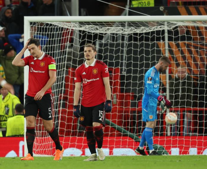 JRS直播网04月14日讯 曼联周四在欧联杯四分之一决赛首回合踢出一场怪异的比赛,最终比分是2-2,但4个进球都由红魔球员自己攻入球门。赛后,滕哈格抱怨球队被「坏运气」困扰,但英媒则批评他下半场的换人是奇怪的决定(bizarre decisions)。
