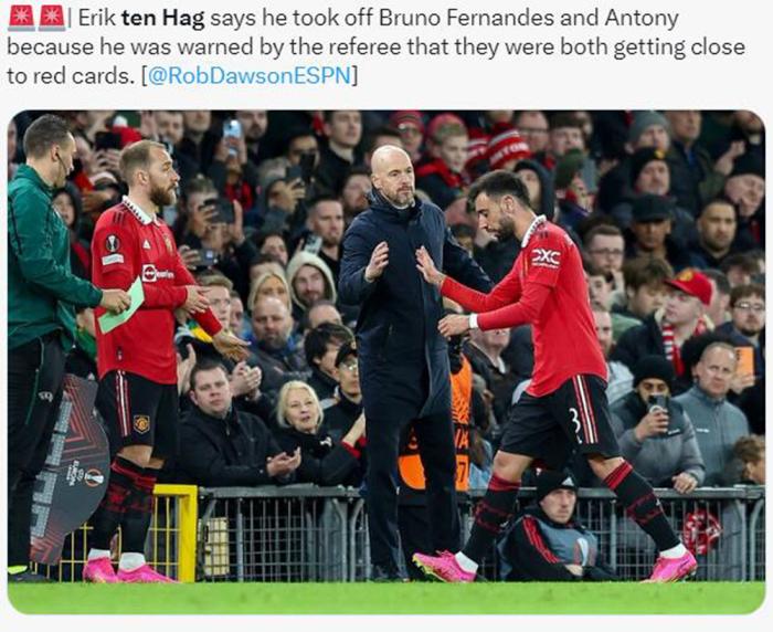 ESPN赛后宣称,滕哈格之所以换下B费和安东尼,是由于裁判警告他,这两名球员接近染红的边界!