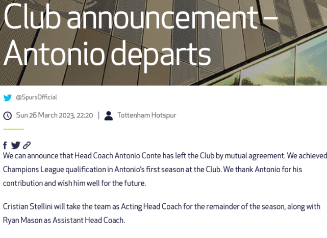 而在上轮英超3-3被副班长南安普顿绝平后,孔蒂接受采访时批评球员自私不互相帮助,批评球队如果不改变,换帅也没用。引发了球队主席列维和部分球员的不满,最终这位意大利性格主帅与热刺“分道扬镳”。4月4日,热刺将在英超第29轮做客挑战埃弗顿。