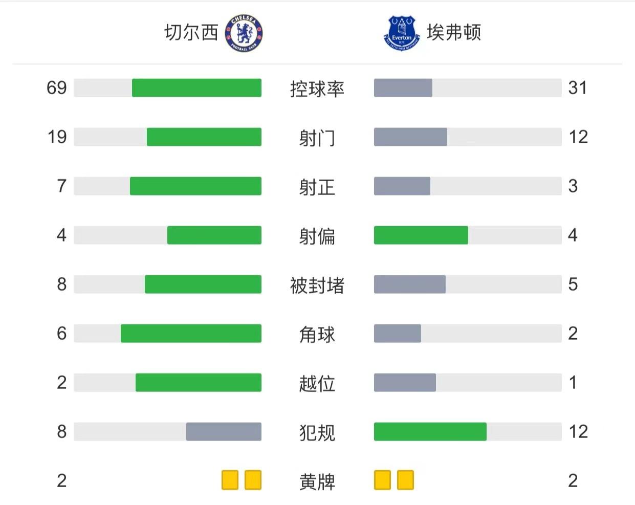 全场比赛结束,切尔西2-2埃弗顿,三连胜被终结。