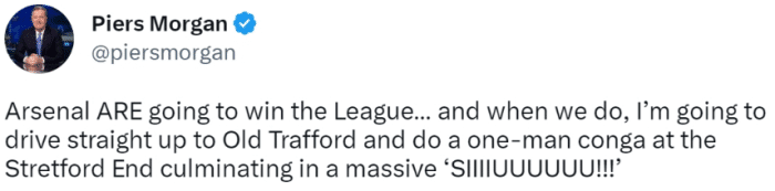 JRS直播网讯03月06日近日,知名主持人皮尔斯-摩根在个人社交媒体上表示,当阿森纳夺得英超冠军时,他会去老特拉福德的死忠看台siu。