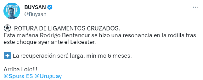 JRS直播网02月13日据乌拉圭记者Buysan报道,本坦库尔十字韧带撕裂,将至少伤缺6个月。