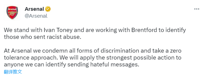 阿森纳表示,我们与伊万-托尼同在,并正在与布伦特福德合作,调查那些种族歧视的人。