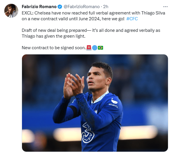 新合同正在起草,席尔瓦完全同意,很快就将完成续约。在履行完这份新合同后,蒂亚戈-席尔瓦将年满39岁。