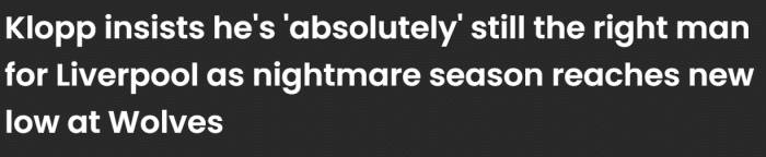 该媒体表示,在0-3输给狼队之后,利物浦陷入了务必困难的境地,但是主教练克洛普坚信他可以带队走出困境。