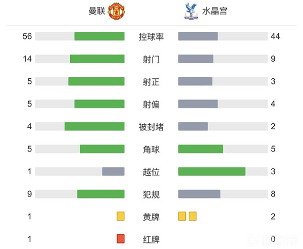 全场比赛结束,最终曼联2-1战胜水晶宫。