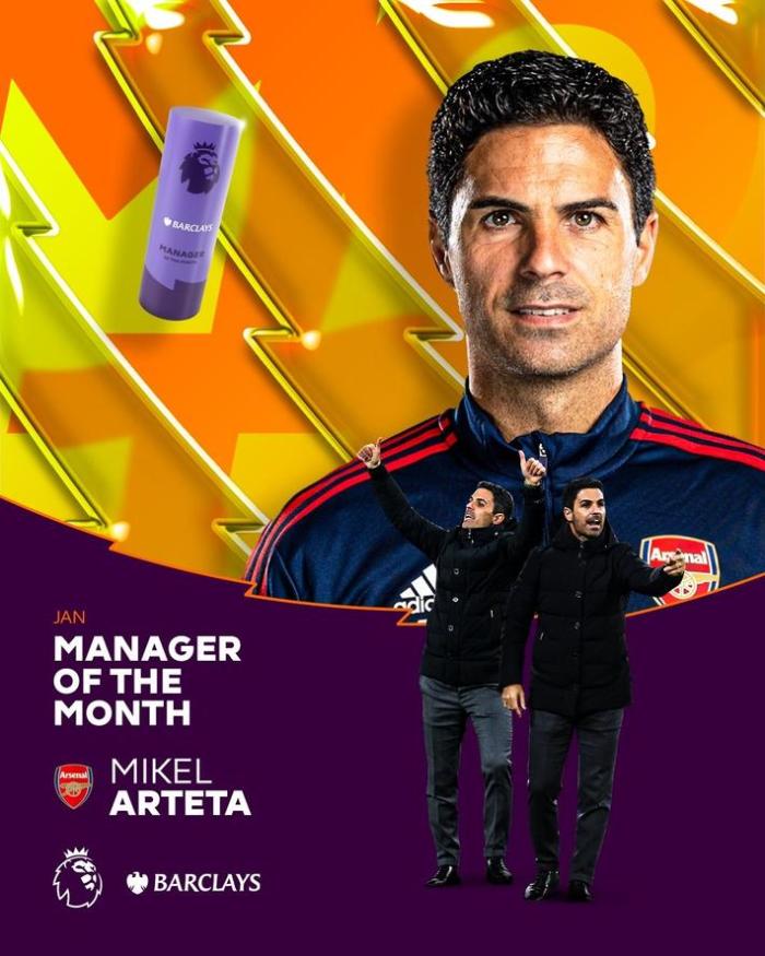 这是阿尔特塔本赛季第3次当选英超月最佳主帅,他此前曾在8月和11与12月(因世界杯缘故,11与12月最佳主帅合并)当选。