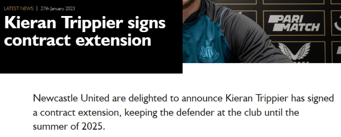 JRS直播网01月28日讯 ,英超纽卡斯尔联官方宣布,球队与右后卫特里皮尔正式续约至2025年。
