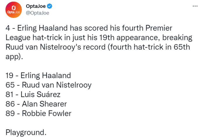 JRS直播网01月23日讯 赛后,据opta统计,哈兰德在19次出场中已经为完成4次帽子戏法,打破由范尼斯特鲁伊创造的英超4次帽子戏法最快纪录。