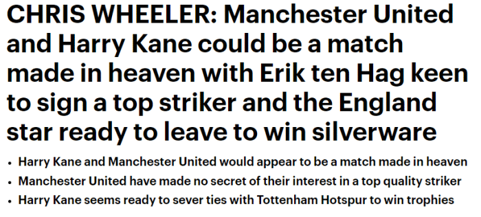《邮报》表示,曼联在冬窗租借签下了韦格霍斯特,这表明他们需要一个正印的中锋。曼联高层开始在探索今夏签下凯恩的可能,而凯恩本人也愿意加盟曼联。