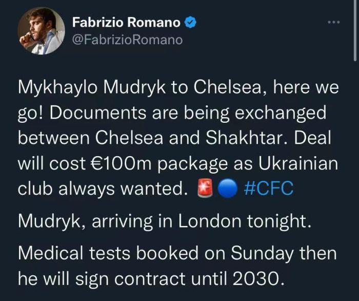 罗马诺表示,herewego!穆德里克将加盟切尔西,蓝军正在与顿涅茨克矿工交换文件,这笔交易的转会费将是1亿欧元。