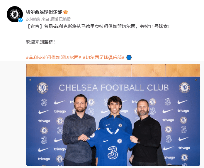 JRS直播网01月12日讯 切尔西官方宣布,若昂-菲利克斯将从马德里竞技租借加盟切尔西,身披11号球衣!