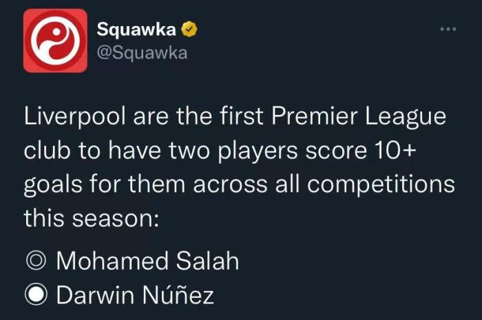 打进这粒进球后,努涅斯本赛季各项赛事已经为利物浦打进10粒进球。根据Squawka统计,利物浦是本赛季首支有2名球员进球上双的英超球队。