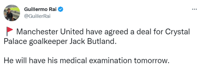 该记者表示,曼联已经与水晶宫门将杰克-巴特兰德达成协议,他将在明天接受体检,租期至本赛季结束。