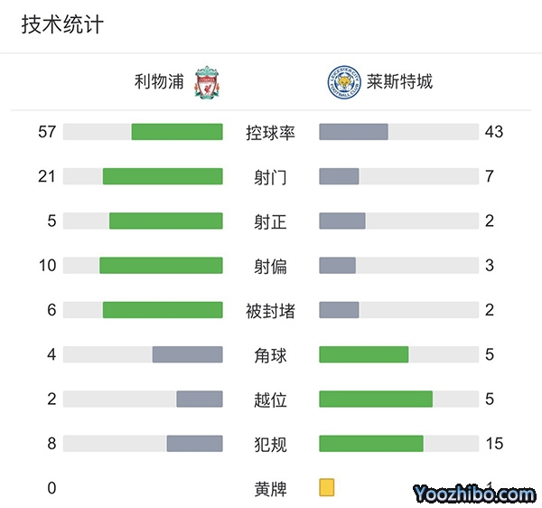 全场比赛结束,最终利物浦2-1莱斯特城获联赛四连胜。