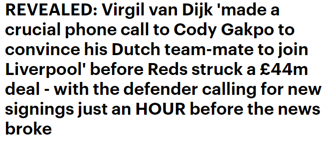 《邮报》表示,在加克波加盟利物浦之前,范迪克确实和他有过电话联系,并且这通电话在一定程度上让加克波下定决心加盟利物浦。