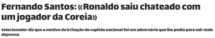 赛后谈及此事,葡萄牙主帅费尔南多-桑托斯表示:“C罗对让他走的韩国球员感到不满,我认为每个人都看到了。佩佩还追上了这名韩国球员,因为他侮辱了C罗,让他赶紧离开。C罗这是在回应那个球员。”