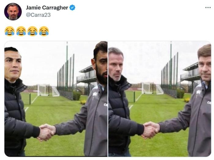 卡拉格批评前利物浦队友杰拉德执教维拉后,两人尴尬握手,他因此P了一张C罗和B费尴尬握手的图。