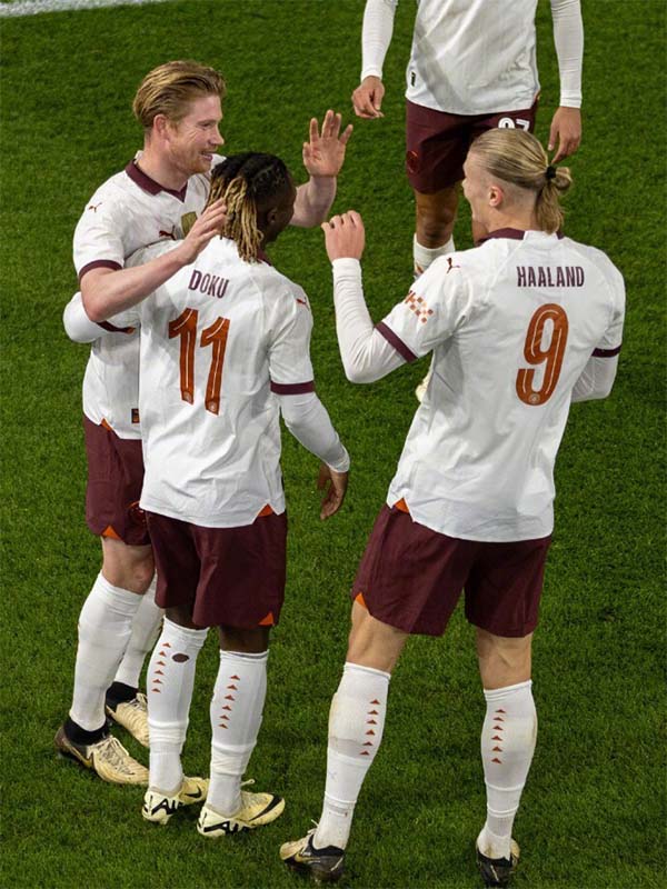 为了能卫冕足总杯冠军,本场比赛瓜迪奥拉派出了德布劳内和哈兰德的王牌组合首发,而两人也不负众望。上半场便3次连线。第3分钟,德布劳内倒三角回传,哈兰德轻松在门前抢点破门。第18和第40分钟,德布劳内则是送出穿透力极强的直塞,帮助哈兰德轻松吃饼,半场便完成帽子戏法。